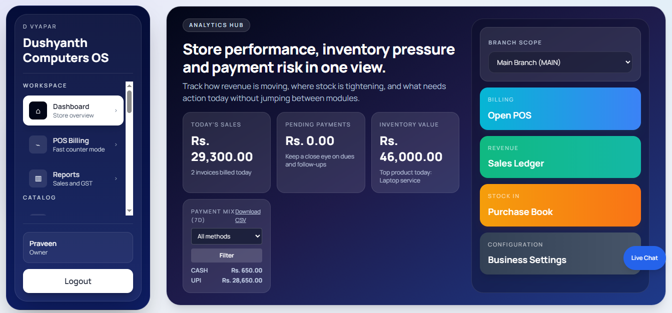 Dvyapar is POS billing software built for kirana stores, pharmacies, hardware and electronics shops in India. Bill faster, stay GST compliant and see sales in one dashboard.